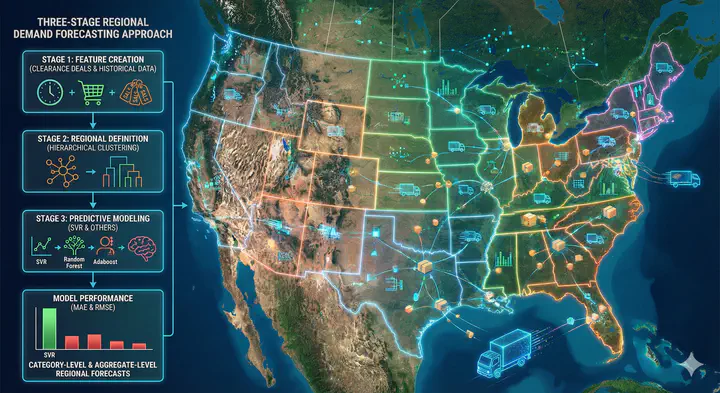 One of the significant sources of cost for online retailers, especially those selling goods in large quantities is operation and logistics. Logsitics planning and optimization are essential in such businesses as the orders must be delivered to customers and this requires accurate transportation planning. Accurate demand forecasting and transportation planning are paramount for e-commerce firms offering clearance deals, as these products can greatly increase sales and demand, but can be a complex task due to the vastness of the covered area. Moreover, since customer behavior and demand may vary in different locations of the covered area, it may be a good idea to develop a more nuanced approach for logistics planning by dividing the area into sub-regions and conducting regional demand forecasting. In this study, we proposed a three-stage approach for regional demand forecasting that includes 1) creating a comprehensive set of features using clearance deals and short-term historical data, 2) defining the regions using hierarchical clustering algorithm, and 3) applying various predictive models to forecast future demands. We used the data for an online retailer company that had transactional information and the clearance deals data. As a results we observed that, in terms of MAE and RMSE metrics, Support Vector Regressor (SVR) outperformed all other models in both category-level and aggregate-level for different regions.